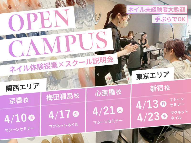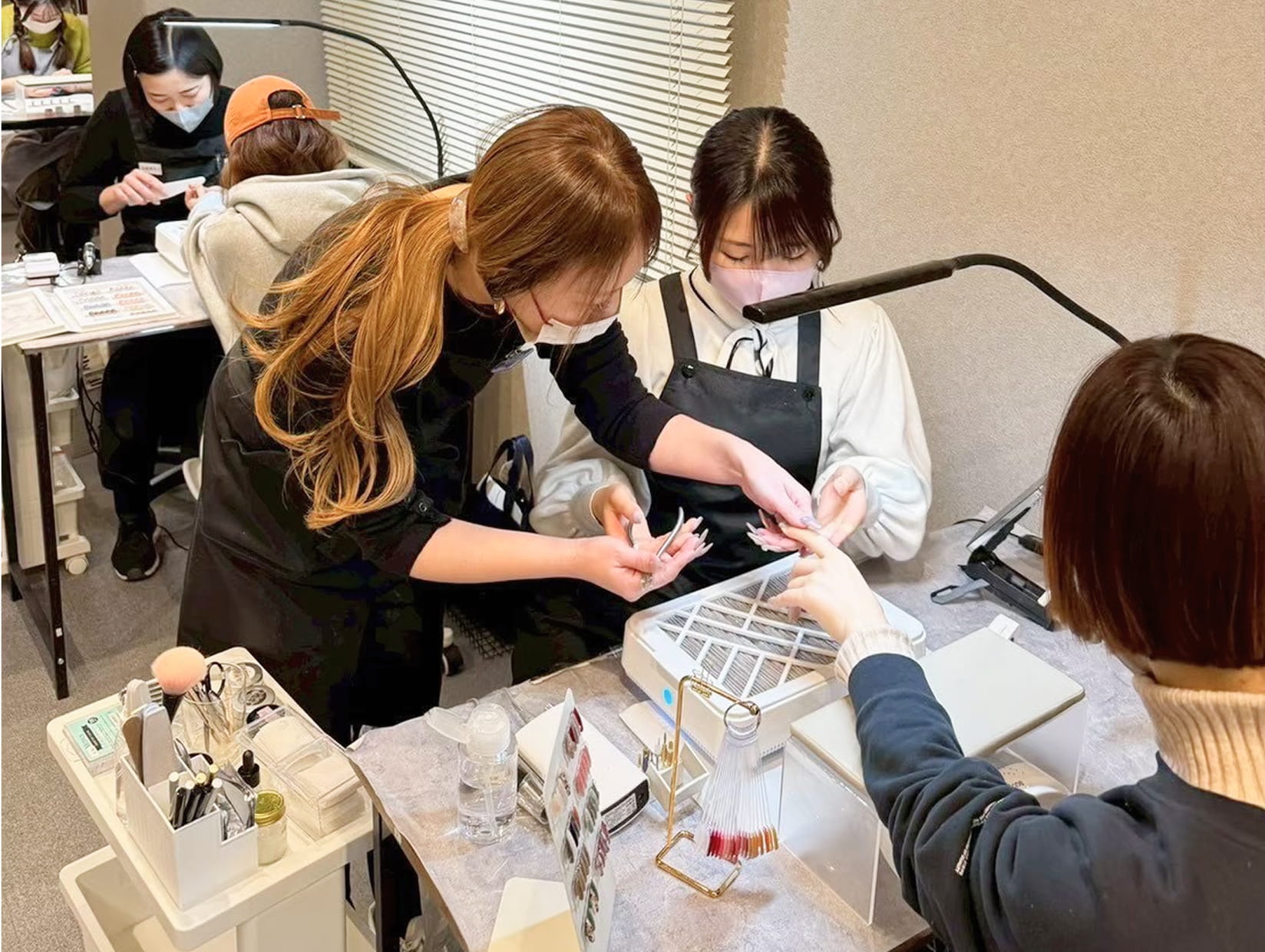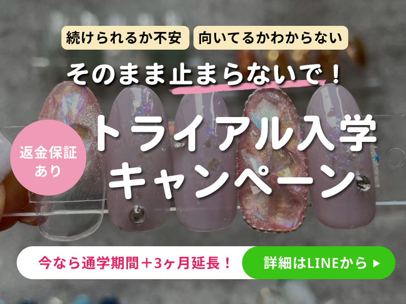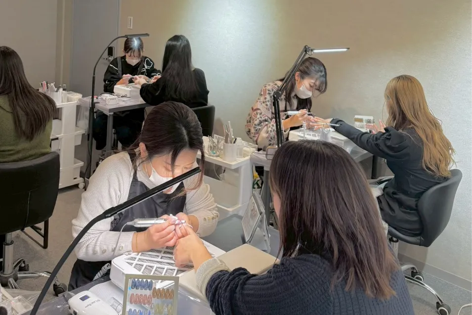 当スクールではスカルプを使用しない事とオフの際に基本的にはアセトンを使わないやり方を推奨していますので匂いのきつい物は比較的少ない環境です◎通学期間内で通学しきれない場合、月16500円で通学期間の延長もできますのでご無理のない範囲でネイルを楽しく学んでいただけると幸いです。